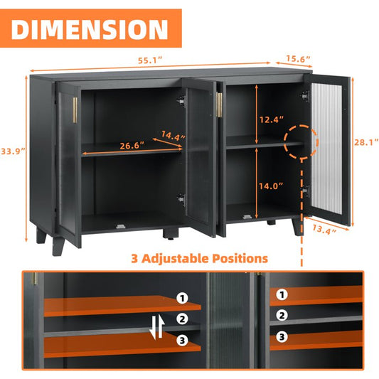 55" Sideboard Buffet Cabinet Credenza Cabinet Large Coffee Bar Cabinet Storage Cabinet with 4 Glass Door and Adjustable Shelves Kitchen Cupboard Console Table for Living Room, Hallway and Dining Room